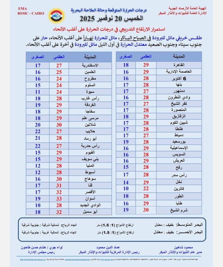 درجات الحرارة اليوم الخميس 20 نوفمبر 2025 :القاهرة العظمى 29 درجة والصغرى 18 درجة. الإسكندرية العظمى 27 درجة والصغرى 17 درجة. مطروح العظمى 24 درجة والصغرى 16 درجة. سوهاج العظمى 30 درجة والصغرى 16 درجة. قنا العظمى 31 درجة والصغرى 17 درجة. فى أسوان العظمى 33 درجة والصغرى 19 درجة.