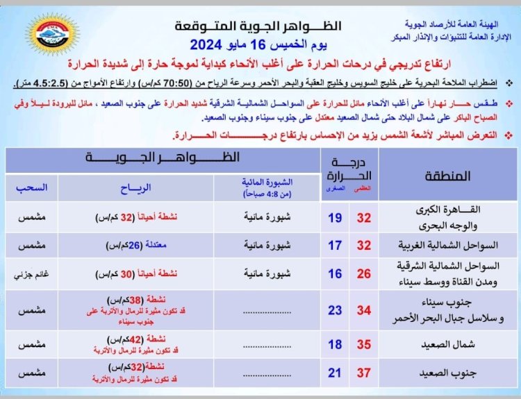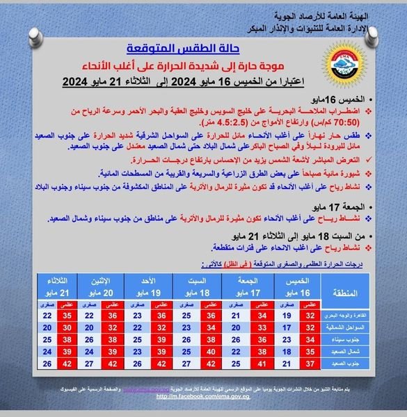 قالت هيئة الأرصاد الجوية إنها تتوقع  أن يشهد اليوم الخميس  ارتفاع تدريجى فى درجات الحرارة على أغلب أنحاء الجمهورية كبداية لموجه حارة إلى شديدة الحرارة ، ويسود طقس حار نهارا على أغلب الأنحاء ، مائب للحرارة على  السواحل الشمالية الشرقية ، شديد الحرارة على جنوب الصعيد ، مائل للبرودة ليلا على شمال البلاد حتى شمال الصعيد ، معتدل على جنوب سيناء وجنوب الصعيد.