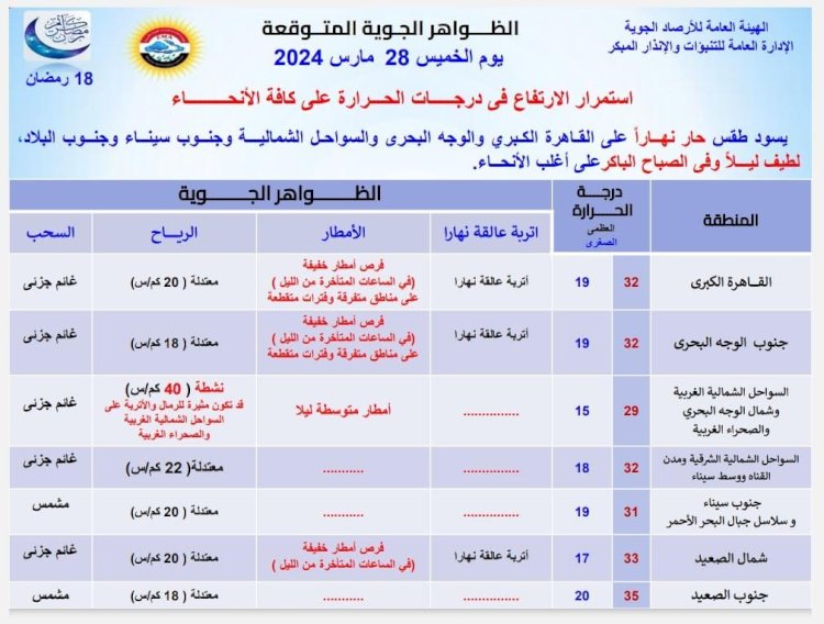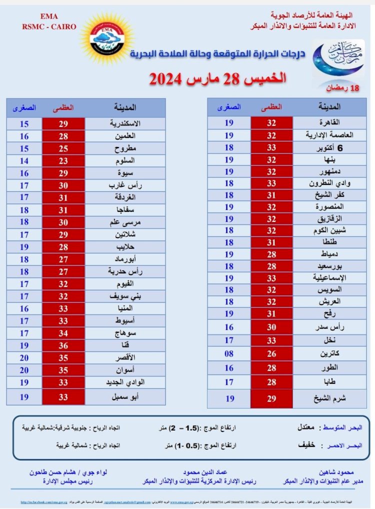 وبالنسبة لدرجات الحرارة اليوم الخميس: القاهرة العظمى 32 درجة والصغرى 19، والإسكندرية العظمى 29 والصغرى 15، ومطروح العظمى 25 درجة والصغرى 15، وسوهاج العظمى 34 درجة والصغرى 17، وقنا العظمى 36 درجة والصغرى 19، وأسوان العظمى 35 درجة والصغرى 20.