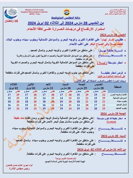 كما تتوقع هيئة الأرصاد الجوية أن يشهد اليوم نشاط رياح قد تكون مثيرة للرمال والأتربة على السواحل الشمالية الغربية والصحراء الغربية، وفرص أمطار خفيفة فى الساعات المتأخرة من الليل على القاهرة الكبرى وجنوب الوجه البحرى وشمال الصعيد .