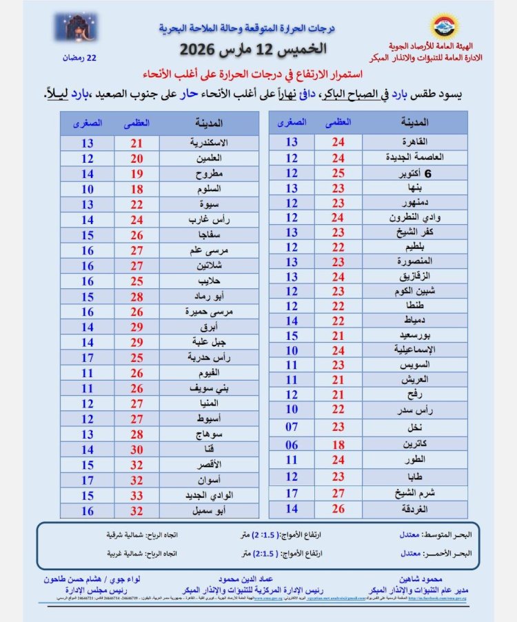 درجات الحرارة اليوم الخميس 12 مارس 2026:القاهرة العظمى 24 درجة والصغرى 13 درجة. الإسكندرية العظمى 21 درجة والصغرى 13 درجة. مطروح العظمى 19 درجة والصغرى 14 درجة. سوهاج العظمى 28 درجة والصغرى 13 درجة. قنا العظمى 30 درجة والصغرى 14 درجة فى أسوان العظمى 32 درجة والصغرى 17 درجة