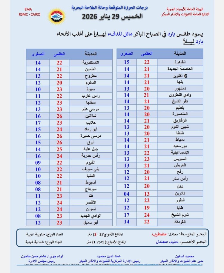 درجات الحرارة اليوم الخميس 29 يناير 2026:القاهرة العظمى 22 درجة والصغرى 15 درجة. الإسكندرية العظمى 22 درجة والصغرى 14 درجة. مطروح العظمى 22 درجة والصغرى 13 درجة. سوهاج العظمى 21 درجة والصغرى 8 درجة. قنا العظمى 23 درجة والصغرى 11 درجة. فى أسوان العظمى 24 درجة والصغرى 12 درجة.