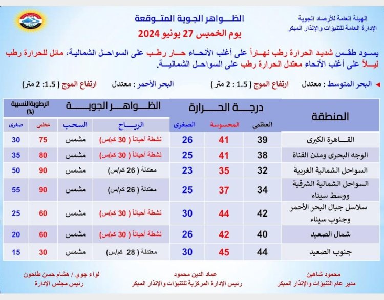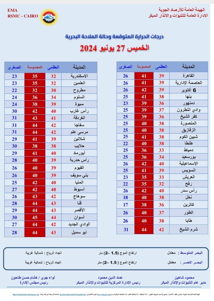 درجات الحرارة اليوم الخميس 27 يونيو 2024: القاهرة العظمى 39 درجة والصغرى 26، والإسكندرية العظمى 32 والصغرى 23، ومطروح العظمى 30 درجة والصغرى 22، وسوهاج العظمى 42 درجة والصغرى 26، وقنا العظمى 43 درجة والصغرى 28، وأسوان العظمى 44 درجة والصغرى 30.