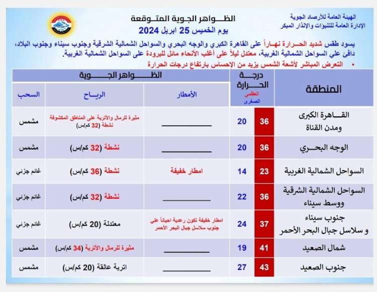 ودرجات الحرارة اليوم الخميس 25 إبريل 2024: القاهرة العظمى 36 درجة والصغرى 20، والإسكندرية العظمى 24 والصغرى 16، ومطروح العظمى 22 درجة والصغرى 15، وسوهاج العظمى 41 درجة والصغرى 25، وقنا العظمى 41 درجة والصغرى 26، وأسوان العظمى 43 درجة والصغرى 27.