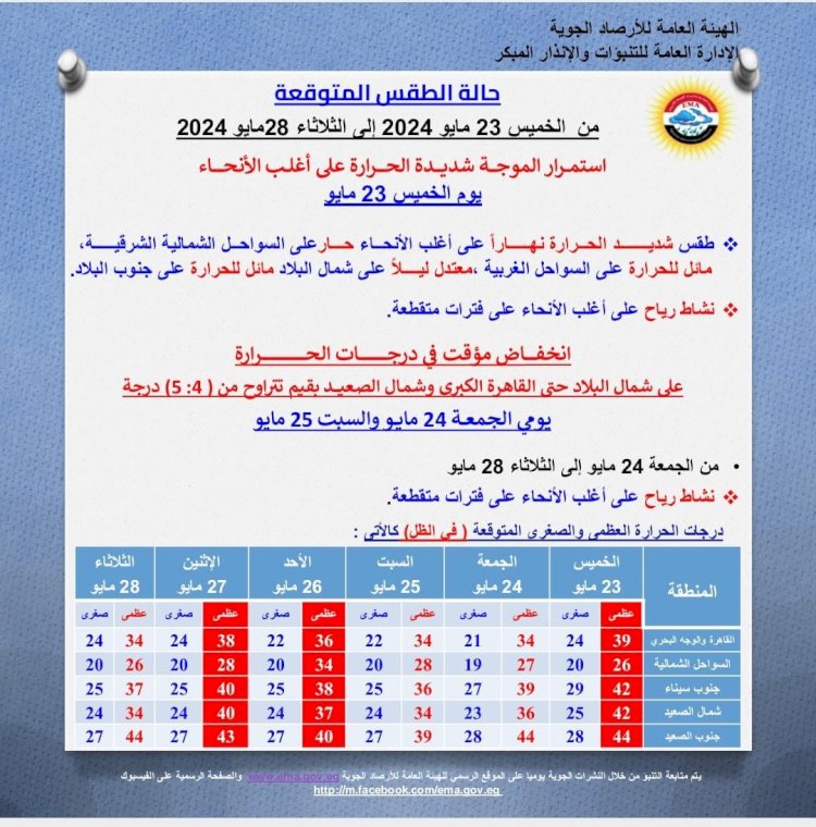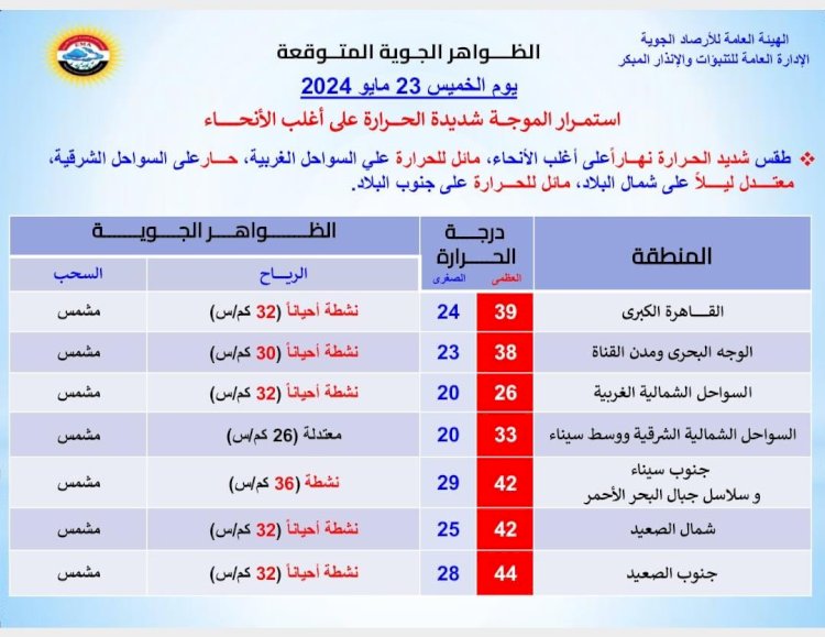 قالت هيئة الأرصاد الجوية إنها تتوقع أن يشهد اليوم الخميس ارتفاع فى درجات الحرارة على أغلب أنحاء الجمهورية واستمرار الموجه شديدة الحرارة، ليسود طقس شديد الحرارة نهارا على أغلب الأنحاء، مائل للحرارة على السواحل الغربية ، حار على السواحل الشرقية، معتدل ليلا على شمال البلاد، مائل للحرارة على جنوب البلاد.