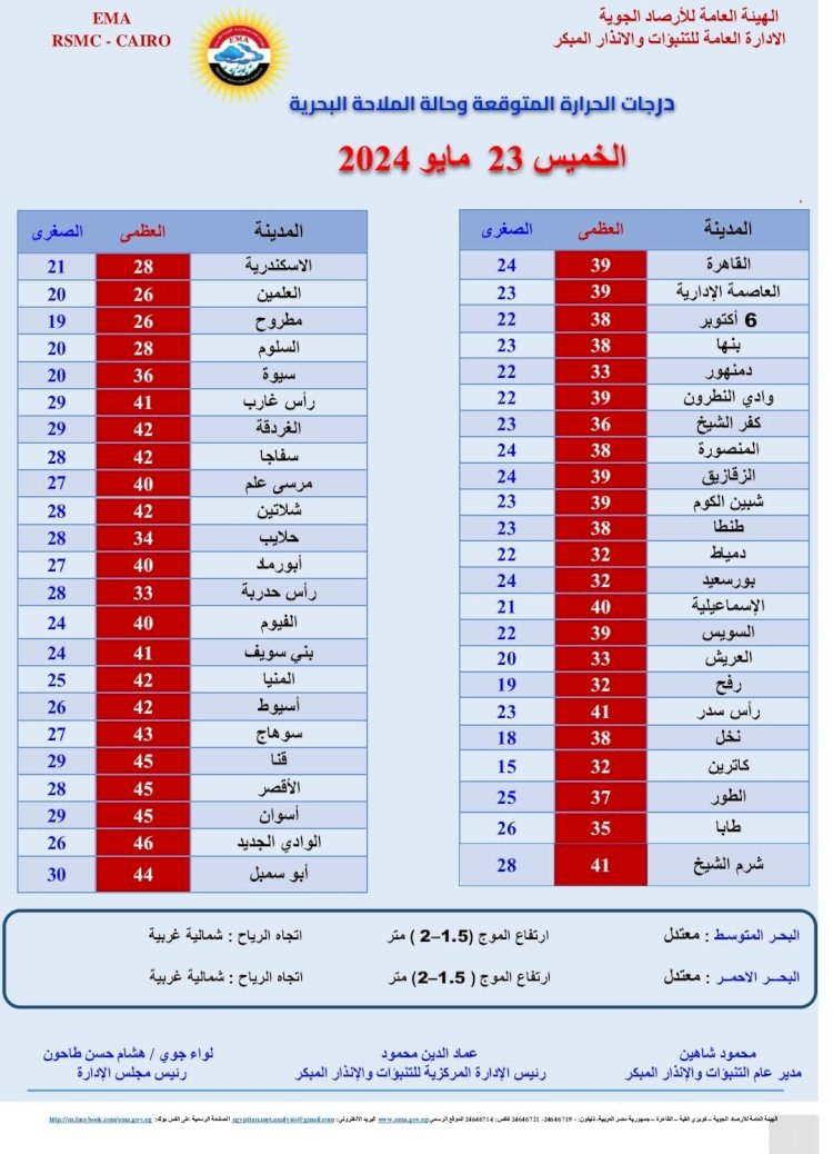 درجات الحرارة اليوم الخميس : القاهرة العظمى 39 درجة والصغرى 24، والإسكندرية العظمى 28 والصغرى 21، ومطروح العظمى 26 درجة والصغرى 19، وسوهاج العظمى 43 درجة والصغرى 27، وقنا العظمى 45 درجة والصغرى 29، وأسوان العظمى 45 درجة والصغرى 29.