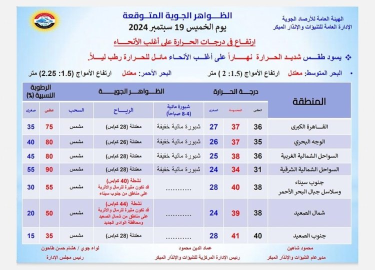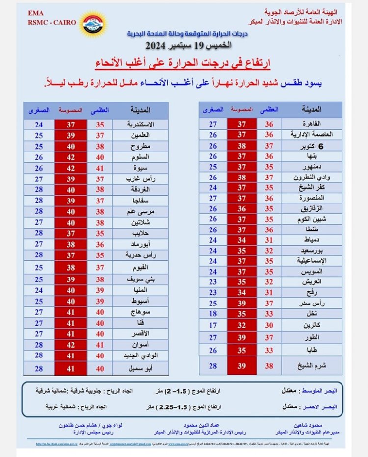 درجات الحرارة المتوقعة اليوم الخميس 19 سبتمبر 2024: القاهرة العظمى 36 درجة والمحسوسة 37 والصغرى 27، والإسكندرية العظمى 35 والمحسوسة 37 والصغرى 24، ومطروح العظمى 38 درجة والمحسوسة 40 والصغرى 25، وسوهاج العظمى 40 درجة والمحسوسة 41 والصغرى 27، وقنا العظمى 40 درجة والمحسوسة 41 والصغرى 27، وأسوان العظمى 41 درجة والمحسوسة 42 والصغرى 28.