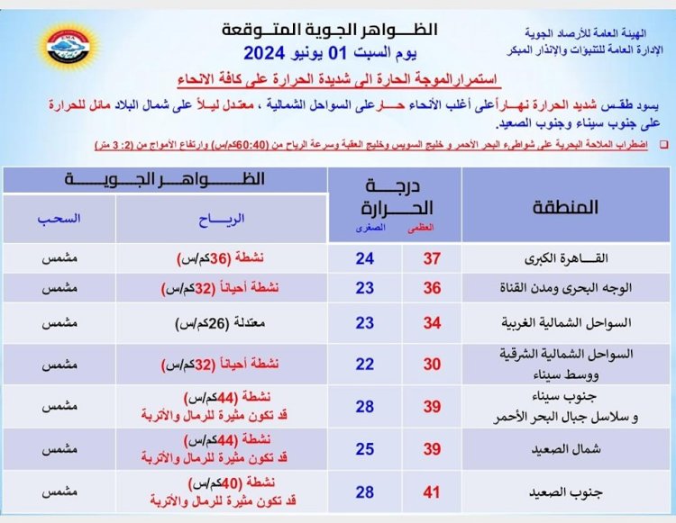 درجات الحرارة اليوم السبت 1 يونيو 2024 : القاهرة العظمى 37 درجة والصغرى 24، والإسكندرية العظمى 34 والصغرى 23، ومطروح العظمى 33 درجة والصغرى 23، وسوهاج العظمى 40 درجة والصغرى 26، وقنا العظمى 41 درجة والصغرى 26، وأسوان العظمى 41 درجة والصغرى 28.