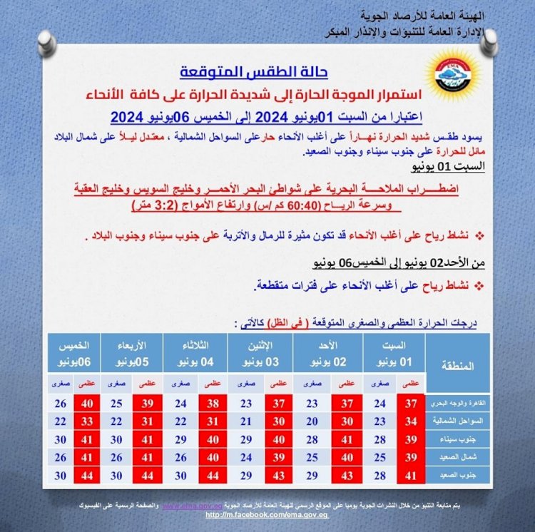 قالت هيئة الأرصاد الجوية إنها تتوقع أن يشهد اليوم السبت استمرار الموجة شديدة الحرارة على كل الأنحاء، ليسود طقس شديد الحرارة نهارا على أغلب الأنحاء، حار على السواحل الشمالية، معتدل ليلا على شمال البلاد، مائل للحرارة على جنوب سيناء وجنوب الصعيد.