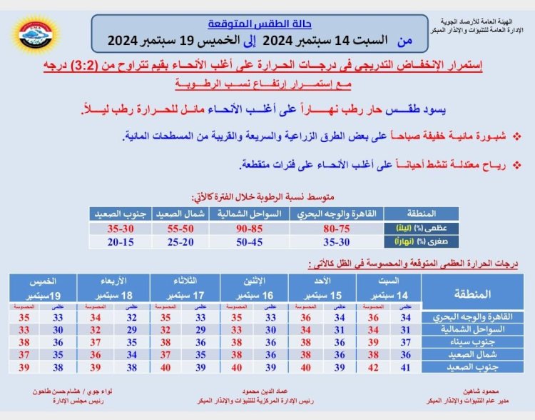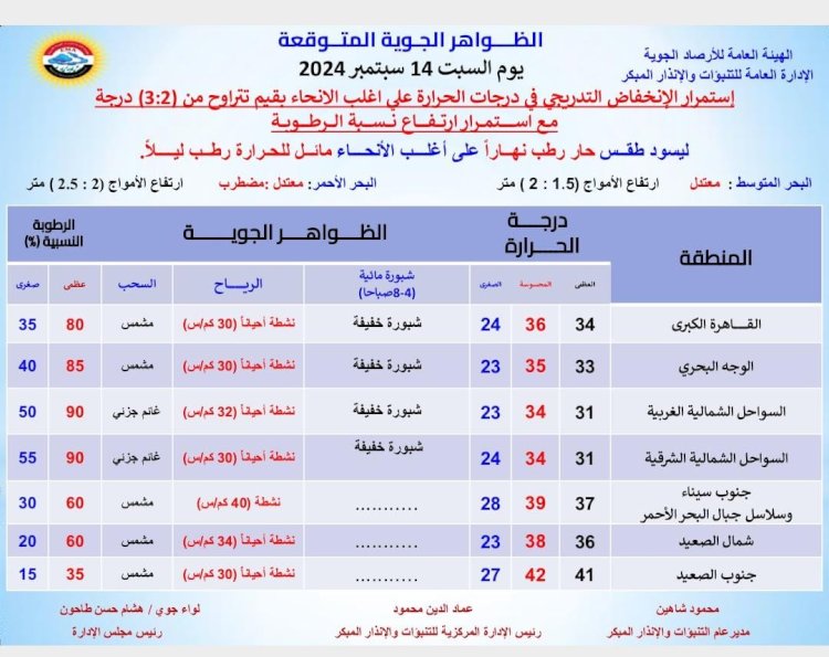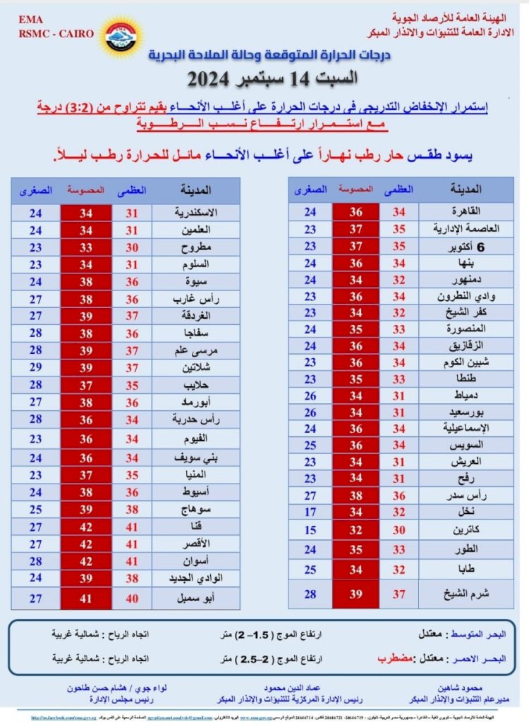 درجات الحرارة اليوم السبت 14 سبتمبر 2024: القاهرة العظمى 34 درجة والصغرى 24، والإسكندرية العظمى 31 والصغرى 24، ومطروح العظمى 30 درجة والصغرى 23، وسوهاج العظمى 38 درجة والصغرى 25، وقنا العظمى 41 درجة والصغرى 27، وأسوان العظمى 41 درجة والصغرى 28.