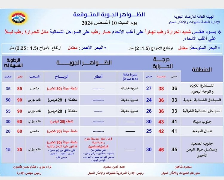 درجات الحرارة اليوم السبت 10 أغسطس 2024 : القاهرة العظمى 36 درجة والصغرى 27، والإسكندرية العظمى 33 والصغرى 24، ومطروح العظمى 32 درجة والصغرى 25، وسوهاج العظمى 44 درجة والصغرى 27، وقنا العظمى 45 درجة والصغرى 29، وأسوان العظمى 46 درجة والصغرى 30.