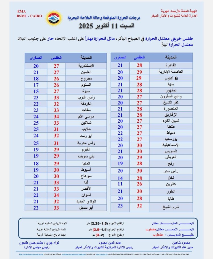 درجات الحرارة اليوم السبت 11 أكتوبر 2025  القاهرة العظمى 28 درجة والصغرى 21 درجة. الإسكندرية العظمى 27 درجة والصغرى 20 درجة. مطروح العظمى 26 درجة والصغرى 18 درجة.سوهاج العظمى 30 درجة والصغرى 20 درجة. قنا العظمى 33 درجة والصغرى 21 درجة.أسوان العظمى 34 درجة والصغرى 22 درجة.
