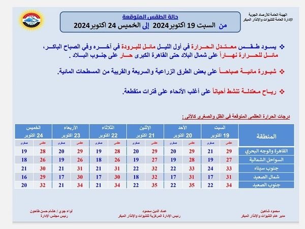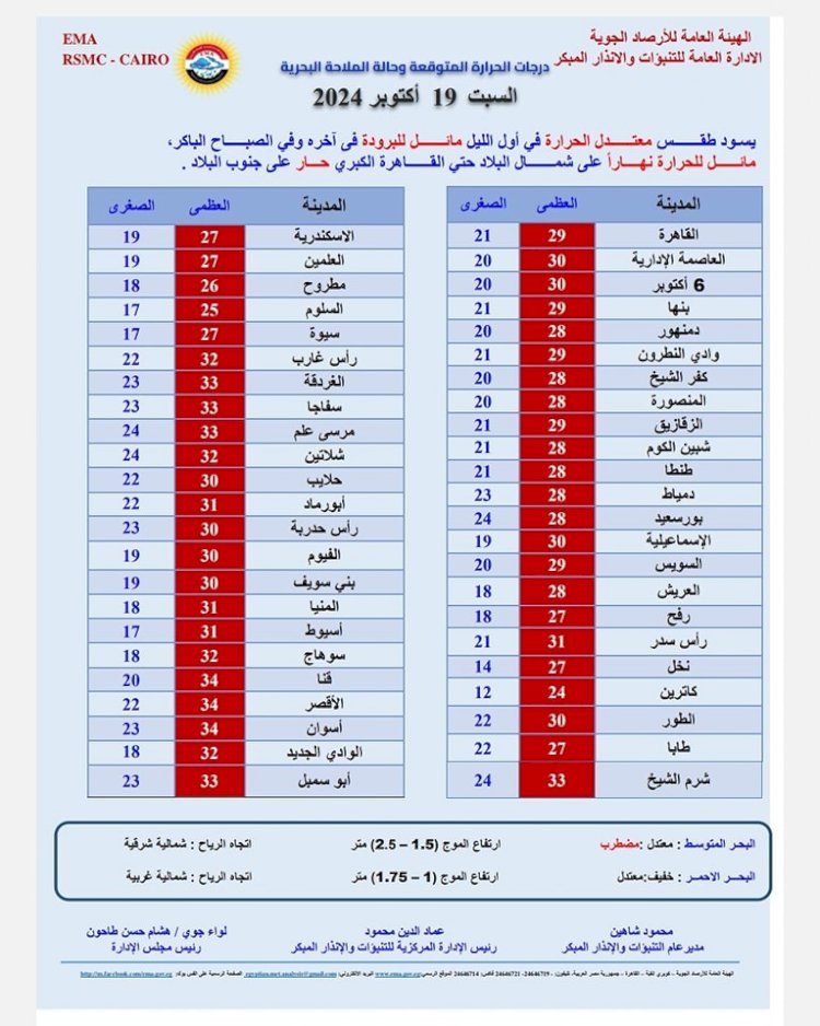 درجات الحرارة المتوقعة اليوم السبت 19 أكتوبر 2024: القاهرة العظمى 29 درجة والصغرى 21، والإسكندرية العظمى 27 والصغرى 19، ومطروح العظمى 26 درجة والصغرى 18، وسوهاج العظمى 32 درجة، والصغرى 18، وقنا العظمى 34 درجة والصغرى 20، وأسوان العظمى 34 درجة والصغرى 23.