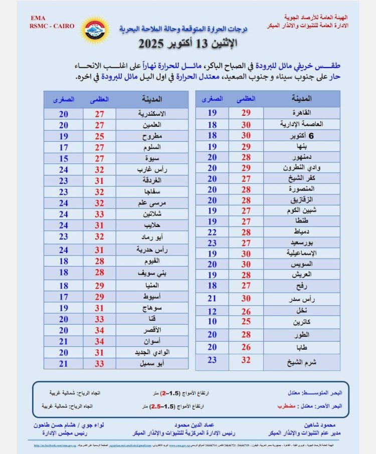 درجات الحرارة اليوم الأثنين 13 أكتوبر 2025: القاهرة العظمى 29 درجة والصغرى 19 درجة. الإسكندرية العظمى 27 درجة والصغرى 20 درجة. مطروح العظمى 25 درجة والصغرى 19 درجة.سوهاج العظمى 31 درجة والصغرى 19 درجة. قنا العظمى 33 درجة والصغرى 20 درجة. أسوان العظمى 34 درجة والصغرى 21 درجة.