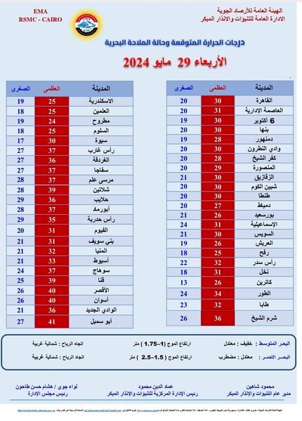 درجات الحرارة اليوم الأربعاء 29 مايو 2024: القاهرة العظمى 30 درجة والصغرى 20، والإسكندرية العظمى 25 والصغرى 19، ومطروح العظمى 24 درجة والصغرى 19، وسوهاج العظمى 37 درجة والصغرى 24، وقنا العظمى 39 درجة والصغرى 25، وأسوان العظمى 40 درجة والصغرى 26.