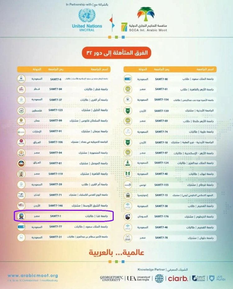 في إنجاز أكاديمي جديد يُضاف إلى سجل النجاحات المتميزة، تأهل فريق كلية الحقوق (طالبات) بجامعة قنا إلى دور الـ(32) من أصل نحو 180 فريق مشارك في النسخة السابعة من مسابقة التحكيم التجاري الدولية، التي ينظمها المركز السعودي للتحكيم التجاري، بالتعاون مع لجنة الامم المتحدة للقانون التجاري الدولي ، وذلك بعد اجتياز المراحل التمهيدية التي أُقيمت عن بُعد.