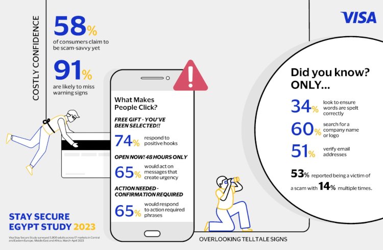 كشفت أحدث دراسة قدمتها شركة "فيزا" تحت عنوان "ابق آمنًا" ، عن أن الثقة المفرطة للمستخدمين في مصر، تجعلهم عُرضة للوقوع كضحايا لعمليات نصب إلكتروني بشكل يدعو للتحذير منها، وتحذر المستخدمين لكروت الـ "فيزا" لعدم التجاوب مع الرسائل الغامضة التي تحمل في محتواها كلمات جذابة، مثل "هدية مجانية"، "لقد تم اختيارك"، و"أنت الفائز".