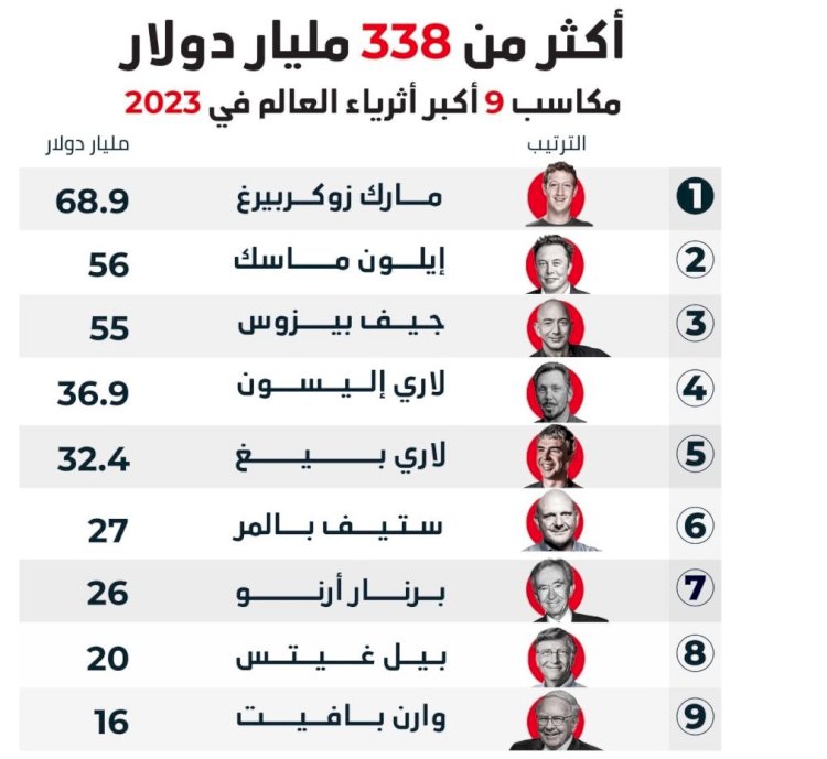 البيانات إلى أن تسعة من أكبر أثرياء العالم حققوا مكاسب ضخمة خلال عام 2023 فقد قفزت ثرواتهم من مستوى 984.8 مليار دولار في بداية عام 2023 إلى نحو 1323 مليار دولار في نهاية العام.
