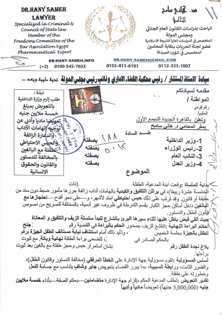 «« وأشار سامح في دعواه إلى أن تلك الممارسات تخالف نصوص الدستور المصري، لاسيما المواد (51) و(54) و(57) و(80) و(96) و(99)، التي تؤكد على صون الكرامة الإنسانية، وحرمة الحياة الخاصة، والمصلحة الفضلى للطفل، وقرينة البراءة، وتكفل التعويض العادل عن أي انتهاك للحقوق.