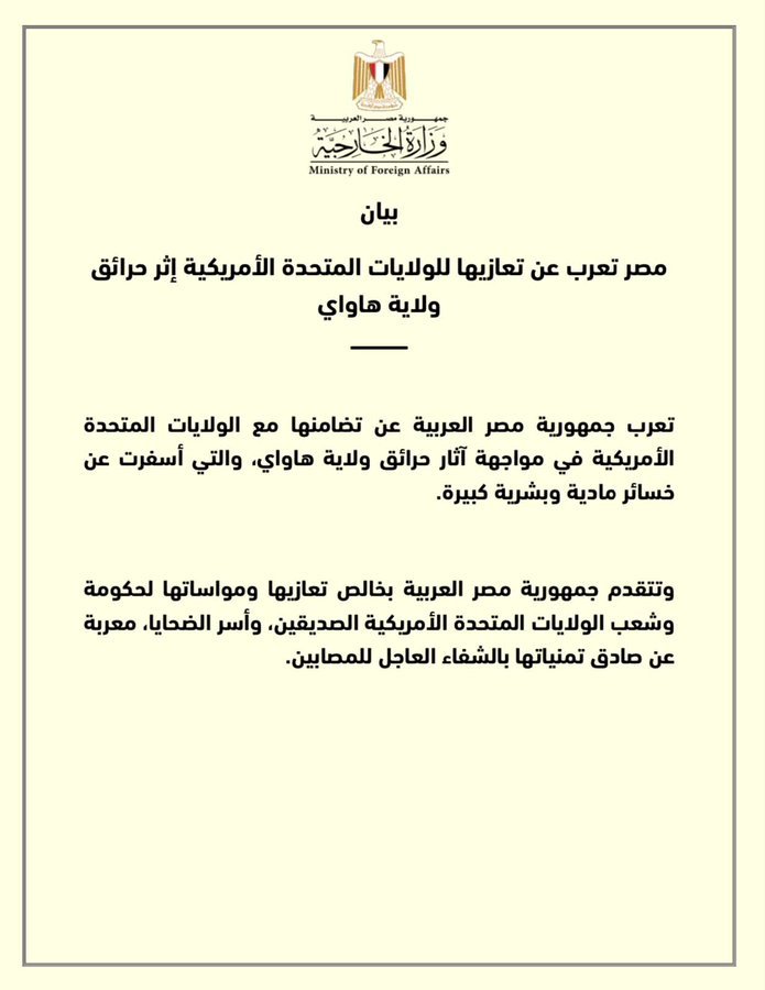 أعربت جمهورية مصر العربية اليوم الأحد، عن تضامنها مع الولايات المتحدة الأمريكية في مواجهة آثار حرائق ولاية هاواي والتي أسفرت عن خسائر مادية وبشرية كبيرة.
