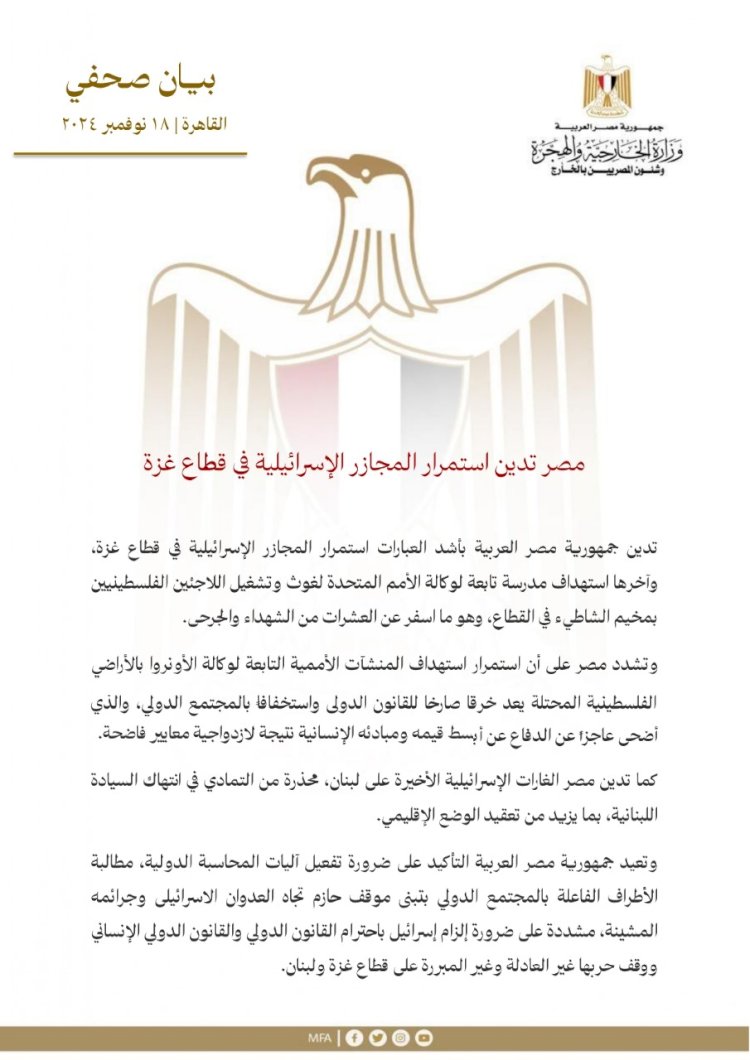 وتعيد جمهورية مصر العربية التأكيد على ضرورة تفعيل آليات المحاسبة الدولية، مطالبة الأطراف الفاعلة بالمجتمع الدولي بتبنى موقف حازم تجاه العدوان الإسرائيلي وجرائمه المشينة، مشددة على ضرورة إلزام إسرائيل باحترام القانون الدولي والقانون الدولي الإنساني ووقف حربها غير العادلة وغير المبررة على قطاع غزة ولبنان.
