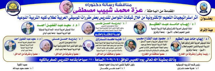 حصلت الباحثة عزة محمد شبيب مصطفى، على درجة الدكتوراة فى تخصص موسيقى عربية "عود" بقسم التربية الموسيقية، بكلية التربية النوعية بجامعة جنوب الوادي، بتقدير عام ممتاز A طبقا لنظام الساعات المعتمدة، مع التوصية بتداول الرسالة بين الجامعات المصرية، وذلك عن موضوع رسالتها المعنونة: “أثر استراتيجيات التعليم الإلكترونية من خلال شبكات التواصل لتدريس بعض مقررات الموسيقي العربية لطلاب كليه التربية النوعية”.