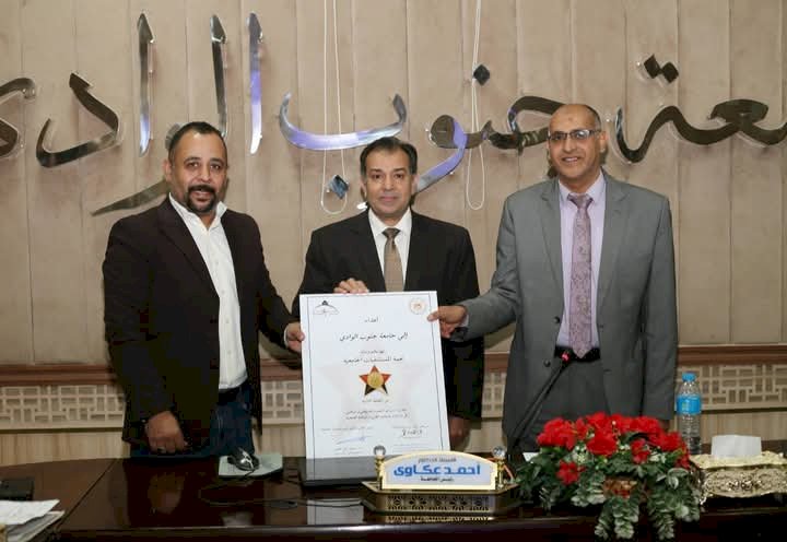 سلم الدكتور أحمد عكاوي، رئيس جامعة جنوب الوادي، وسام نجمة المستشفيات الجامعية من الطبقة الثانية والمقدم من المجلس الأعلى للمستشفيات الجامعية برئاسة الدكتور محمد أيمن عاشور وزير التعليم العالي والبحث العلمي، وذلك تكريمًا لجهود الجامعة البارزة في دعم وتطوير منظومة المستشفيات الجامعية للدكتور علي غويل عميد كلية الطب رئيس مجلس إدارة مستشفيات قنا الجامعية، والدكتور حجاجي منصور المدير التنفيذي للمستشفيات الجامعية