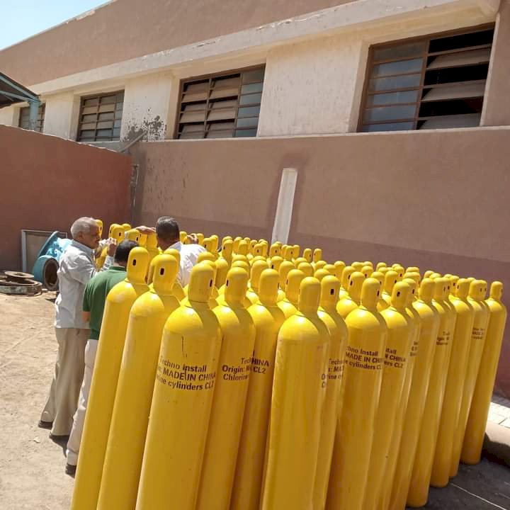انه تم توريد 135 أسطوانة كلور سعة وحجم 65 كجم للاستخدام في أعمال حقن الكلور بمحطات الشركة بجميع مراكز المحافظة وذلك لسهولة الاستخدام والنقل والتداول وسهولة التعامل في حدوث اي مخاطر وجارى التوزيع بالمحطات الماهولة والمكتظة بالسكان والقريبة من المواطنين لتوفير بيءة امان واستقرار لجميع العاملين والمواطنين بجميع أفرع الشركة ومراكز المحافظة