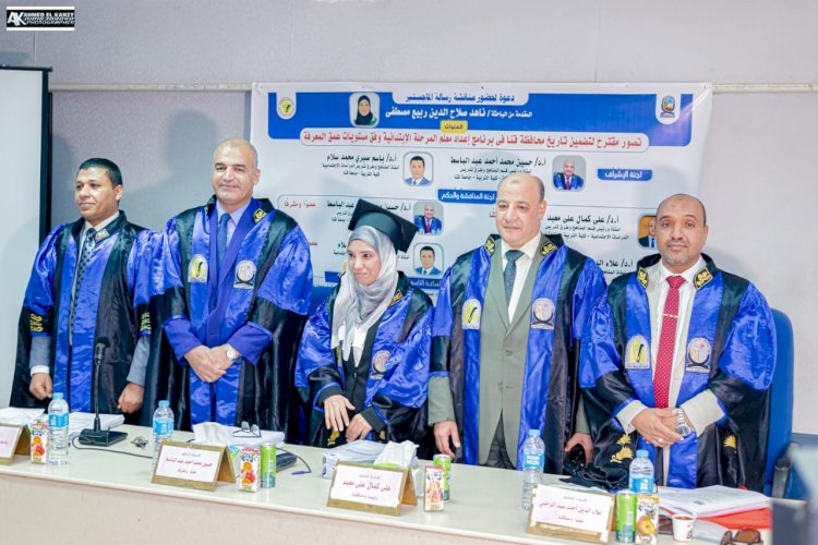 شهدت كلية التربية بقنا مناقشة رسالة الماجستير المقدمة من الباحثة/ ناهد صلاح الدين ربيع مصطفى، بعنوان: «تصور مقترح لتضمين تاريخ محافظة قنا في برنامج إعداد معلم المرحلة الابتدائية وفق مستويات عمق المعرفة»، وذلك تحت رعاية الأستاذ الدكتور/ أحمد عكاوي، رئيس الجامعة، والأستاذ الدكتور/ محمد وائل عبدالعظيم، نائب رئيس الجامعة لشؤون الدراسات العليا والبحوث، والأستاذ الدكتور/ عصام علي الطيب، عميد كلية التربية.