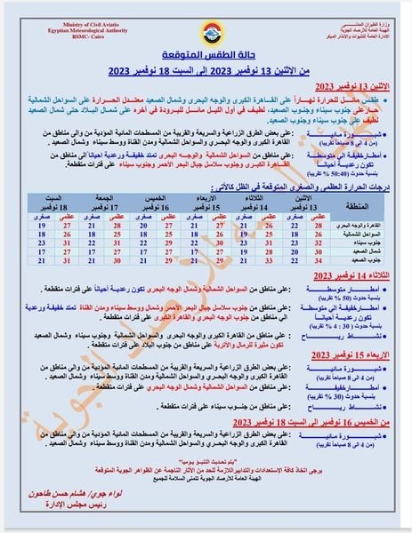 وتتوقع هيئة الأرصاد الجوية أن يشهد اليوم شبورة مائية صباحا على بعض الطرق الزراعية والسريعة والقريبة من المسطحات المائيه على بعض المناطق .
