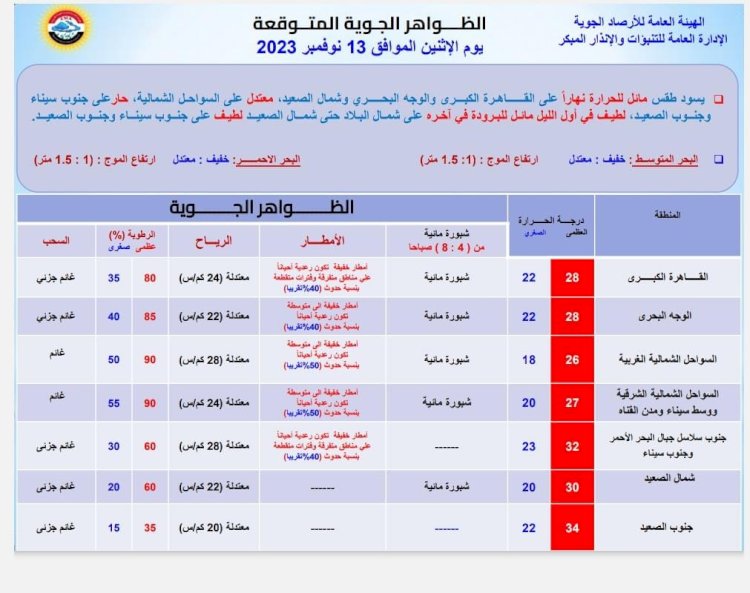 قالت هيئة الأرصاد الجوية إنها تتوقع أن يشهد اليوم الإثنين، طقس مائل للحرارة نهاراً على القاهرة الكبرى والوجه البحرى وشمال الصعيد، معتدل على السواحل الشمالية، حار على جنوب سيناء، وجنوب الصعيد، لطيف فى أول الليل مائل للبرودة فى آخره على شمال البلاد حتى شمال الصعيد، لطيف على جنوب سيناء وجنوب الصعيد.