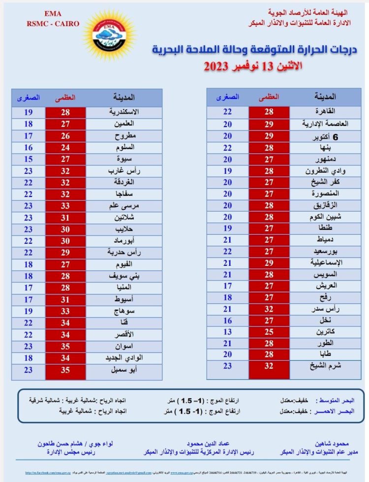 وبالنسبة لدرجات الحرارة اليوم الإثنين: القاهرة العظمى 28 درجة والصغرى 22، والإسكندرية العظمى 28 والصغرى 19، ومطروح العظمى 26 درجة والصغرى 17، وسوهاج العظمى 33 درجة والصغرى 19، وقنا العظمى 34 درجة والصغرى 22، وأسوان العظمى 35 درجة والصغرى 23.