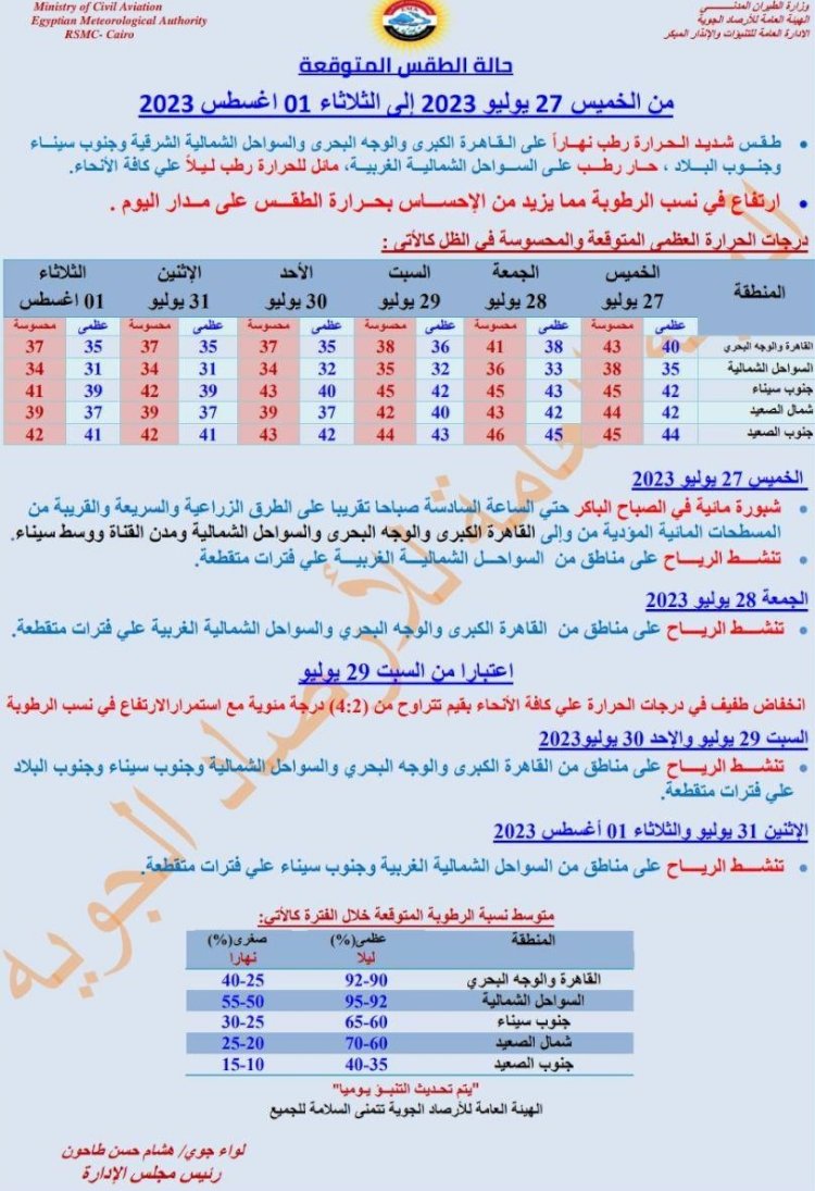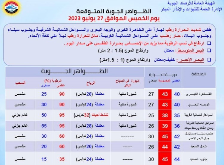 تتوقع هيئة الأرصاد الجوية أن يشهد اليومالخميس 27 يوليو 2023 ارتفاعا فى درجات الحرارة، ليسود طقس شديد الحرارة رطب نهارا على القاهرة الكبرى والوجه البحرى والسواحل الشرقية جنوب سيناء و جنوب الصعيد ، حار رطب على السواحل الشمالية الغربية ، مائل للحرارة رطب ليلا على كافة الأنحاء.