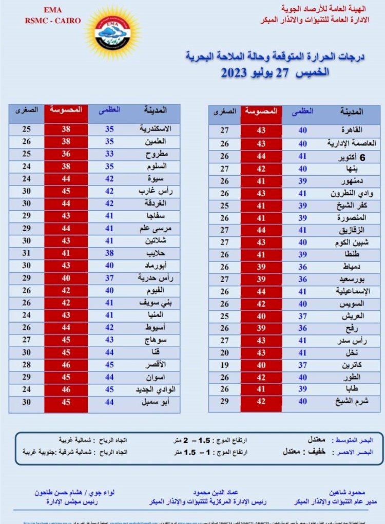 وبالنسبة لدرجات الحرارة، اليوم الخميس : القاهرة العظمى 40 درجة والمحسوسة 43 درجة والصغرى 27 درجة، والإسكندرية العظمى 35 والصغرى 25 درجة، ومطروح العظمى 33 درجة والصغرى 25 درجة، وسوهاج العظمى 43 درجة والصغرى 27 درجة، وقنا العظمى 44 درجة والصغرى 30 درجة، وأسوان العظمى 44 درجة والمحسوسة 45 والصغرى 29 درجة.