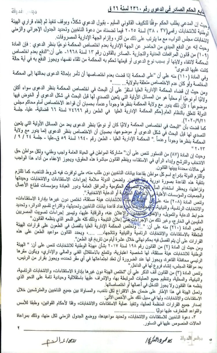 أصدرت محكمة القضاء الإداري بمحافظة البحيرة (مجلس الدولة بدمنهور)، اليوم، حكمًا في الدعوى المقامة من الدكتور ذهدي الشامي، القيادي بحزب التحالف الشعبي الاشتراكي، والتي طالب فيها ببطلان قرار الهيئة الوطنية للانتخابات بدعوة الناخبين لانتخابات مجلس النواب، استنادًا إلى أن القرار صدر بناءً على قانون تقسيم الدوائر الانتخابية الذي وصفه بأنه مخالف للدستور والعهد الدولي للحقوق المدنية والسياسية الذي صدقت عليه مصر عام 1982.