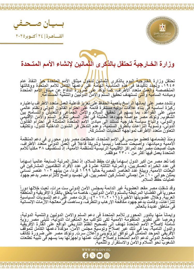 تحتفل وزارة الخارجية اليوم بالذكرى الثمانين لميثاق الأمم المتحدة الذي دخل حيز النفاذ عام 1945، وتعد هذه المناسبة فرصة للتأكيد على حرصها على دعم الأمم المتحدة ووكالاتها المتخصصة، ومساندة أهدافها الرامية إلى تعزيز رفاه الشعوب والدفاع عن مقاصد الأمم المتحدة ومبادئها السامية التي تهدف إلى تعزيز السلم والأمن الدوليين والتنمية المستدامة.