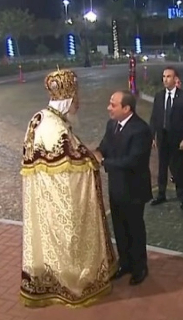 كان في استقبال الرئيس السيسي قداسة البابا تواضروس ولفيف من الاساقفة واعضاء المجلس الملي والقيادات الكنسية وبالطبع جموع الشعب الذين يؤدون الصلاه ليلة عيد الميلاد
