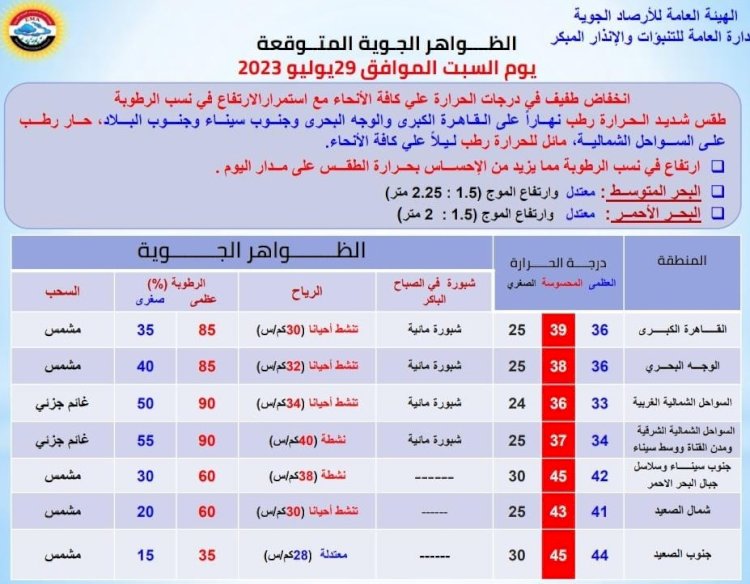 قالت هيئة الأرصاد الجوية انها تتوقع أن يشهد اليوم السبت 29 يوليو 2023 انخفاضا طفيفا فى درجات الحرارة على كل الأنحاء مع استمرار الارتفاع فى نسب الرطوبة ليسود طقس شديد الحرارة رطب نهارا على القاهرة الكبرى والوجه البحرى وجنوب سيناء وجنوب الصعيد، حار رطب على السواحل الشمالية، مائل للحرارة رطب ليلا على الأنحاء كافة.