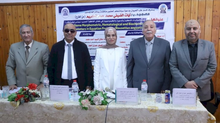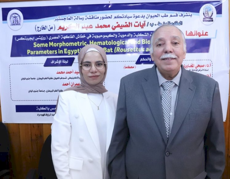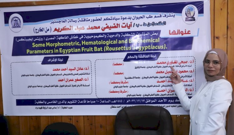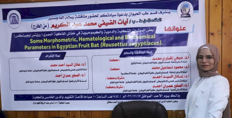 حصلت الباحثة آيات الضيفي محمد عبدالكريم، على درجة الماجستير في الطب البيطري تخصص الأمراض الباطنة "الحيوانات البرية"، وذلك من كلية الطب البيطري بجامعة جنوب الوادي بقنا، عن رسالتها المعنونة: "بعض المؤشرات الشكلية والدموية والكيموحيوية في خفاش الفاكهة المصري (روزيتس إيجيبتكس)".