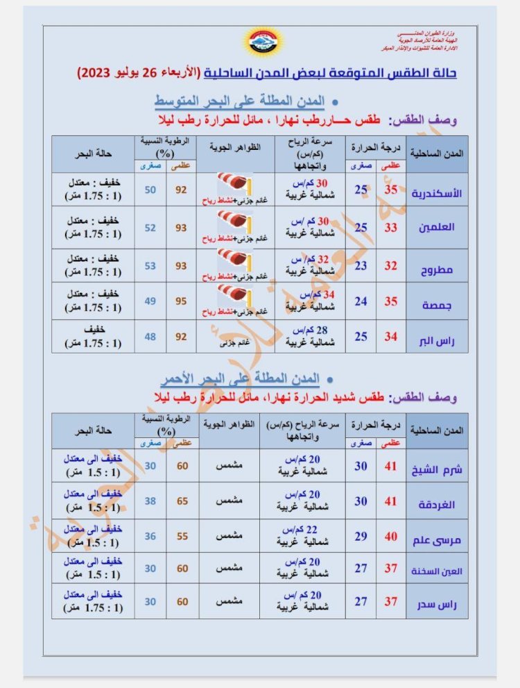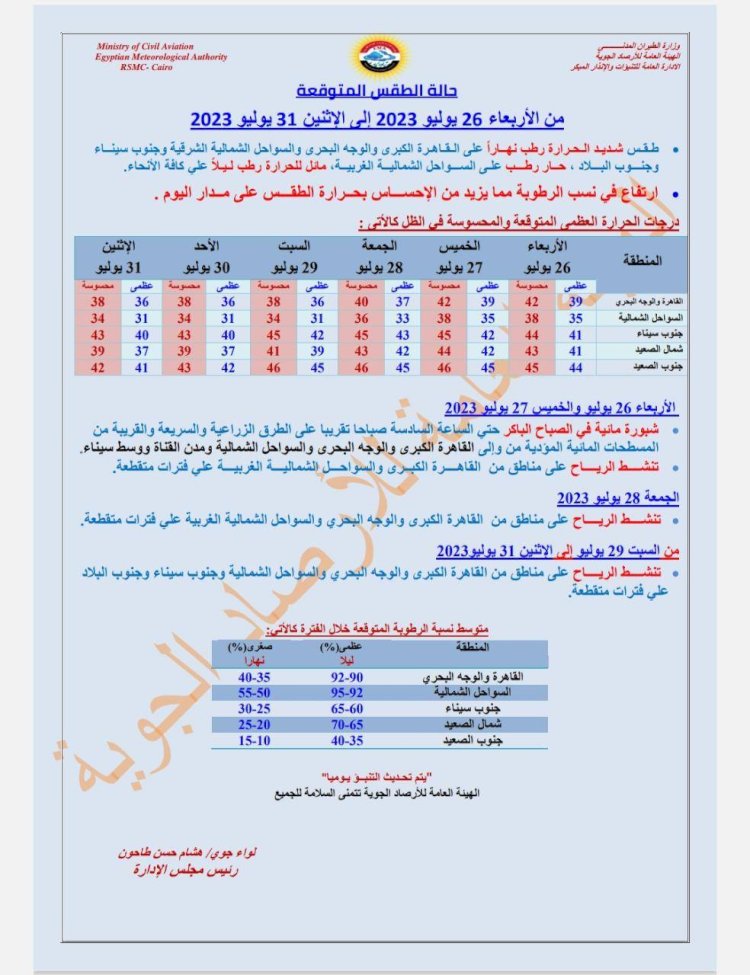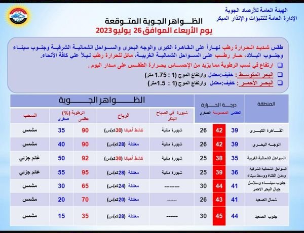 قالت هيئة الأرصاد الجوية أنها تتوقع أن يشهد اليوم الأربعاء 26/7/2023ارتفاع فى درجات الحرارة ، ليسود طقس شديد الحرارة رطب نهارا على القاهرة الكبرى والوجه البحرى والسواحل الشرقية جنوب سيناء و جنوب الصعيد حار رطب على السواحل الشمالية الغربية مائل للحرارة رطب ليلا على كافة الأنحاء.