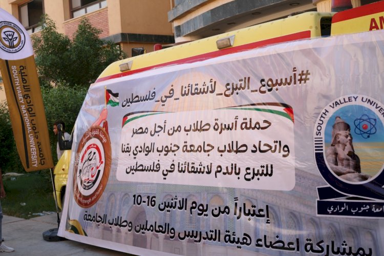 في إطار دعم وتضامن جمهورية مصر العربية تجاه الشعب الفلسطيني الشقيق لتخفيف حدة أحداث العنف التي أدت إلى سقوط العديد من الضحايا والمصابين تواصلت حملة التبرع بالدم لدعم الأشقاء في فلسطين بجامعة جنوب الوادي والتي أطلقتها أسرة طلاب من أجل مصر، و تفقد الدكتور احمد عكاوي رئيس الجامعة بحضور الدكتور محمد سعيد نائب رئيس الجامعة لشئون خدمة المجتمع وتنمية البيئة، والدكتور خالد بن الوليد عميد كلية العلوم والدكتور عبد الحق سيد عميد كلية التربية الرياضية، والدكتورة بدرية حسن وكيل كلية التربية النوعية لخدمة المجتمع، والدكتور فرج خضاري وكيل كلية الهندسة لخدمة المجتمع حملة التبرع بالدم لصالح الأشقاء الفلسطينيين امام المسرح المكشوف حيث تشهد الحملة إقبالا كبير من الطلبة وأعضاء هيئة التدريس والهيئة المعاونة والعاملين بالجامعة كما تفقد رئيس الجامعة حملة التبرع بالدم بكلية العلاج الطبيعى بحضور الدكتور محمود الشاذلى عميد الكلية واعضاء هيئة التدريس ومعاونيهم والجهاز الادارى بالكليه.
