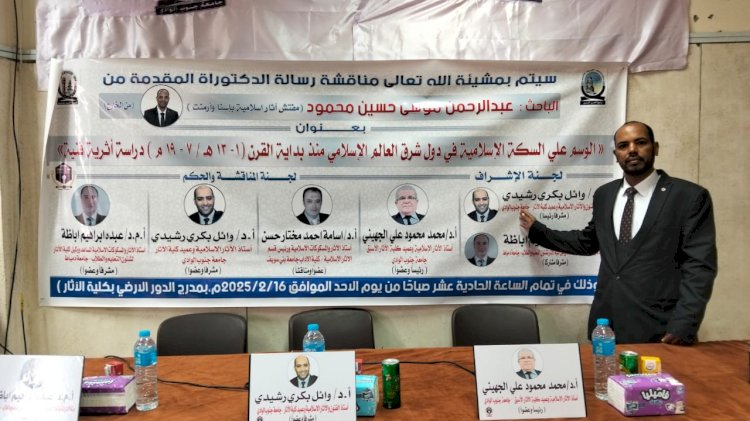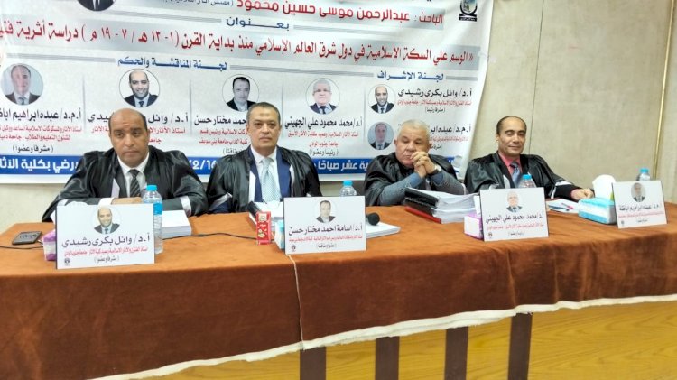 شهدت كلية الآثار بجامعة جنوب الوادي مناقشة رسالة دكتوراه بعنوان "الوسم على السكة الإسلامية في دول شرق العالم الإسلامي منذ بداية القرن (1-3 هـ / 7-19 م) – دراسة أثرية فنية"، والتي تقدم بها الباحث عبد الرحمن موسى حسين محمود، مفتش الآثار الإسلامية بإسنا وأرمنت.