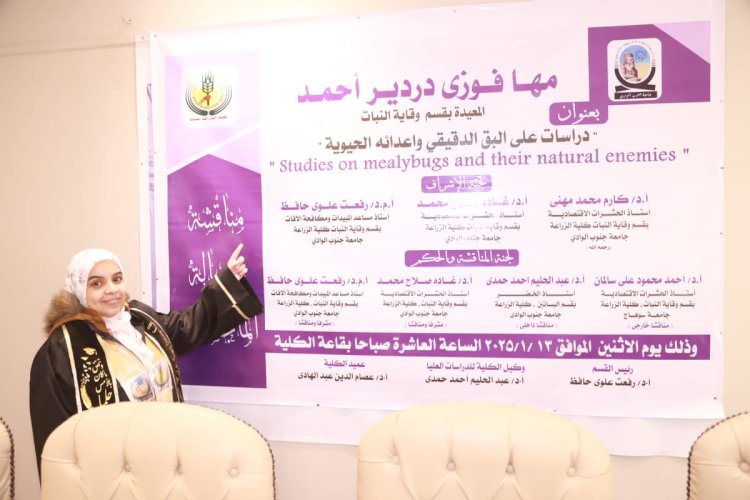 نُوقشت بكلية الزراعة في جامعة جنوب الوادي بقنا رسالة الماجستير المقدمة من الباحثة/ مها فوزي دردير أحمد، المعيدة بقسم وقاية النبات. حملت الرسالة عنوان: "دراسات على البق الدقيقي وأعدائه الحيوية"، وتمت المناقشة تحت رعاية الأستاذ الدكتور/ أحمد عكاوي، رئيس الجامعة، والأستاذ الدكتور محمد وائل عبد العظيم محمد، نائب رئيس الجامعة لشئون الدراسات العليا والبحوث، والأستاذ الدكتور عصام الدين عبد الهادي، عميد الكلية، والأستاذ الدكتور عبد الحليم أحمد حمدي، وكيل الكلية لشئون الدراسات العليا والبحوث، والأستاذ الدكتور رفعت علوي حافظ، رئيس قسم وقاية النبات.