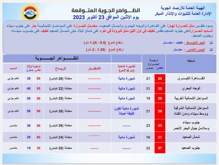 طقس الأثنين 23 أكتوبر طقس مائل للحرارة نهارا وشبورة كثيفة صباحا