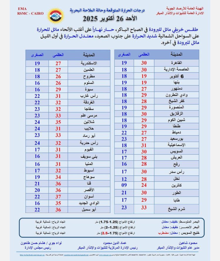 درجات الحرارة اليوم الأحد 26 أكتوبر 2025 : القاهرة العظمى 30 درجة والصغرى 19 درجة.الإسكندرية العظمى 27 درجة والصغرى 19 درجة. مطروح العظمى 26 درجة والصغرى 18 درجة. سوهاج العظمى 34 درجة والصغرى 19 درجة. قنا العظمى 36 درجة والصغرى 21 درجة.أسوان العظمى 37 درجة والصغرى 22 درجة.