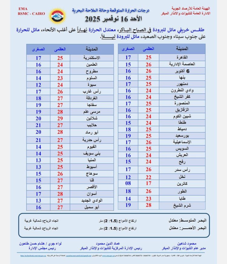 درجات الحرارة اليوم الأحد 16 نوفمبر 2025 :القاهرة العظمى 25 درجة والصغرى 17 درجة. الإسكندرية العظمى 25 درجة والصغرى 17 درجة. مطروح العظمى 24 درجة والصغرى 16 درجة. سوهاج العظمى 26 درجة والصغرى 15 درجة. قنا العظمى 27 درجة والصغرى 15 درجة. فى أسوان العظمى 27 درجة والصغرى 17 درجة.
