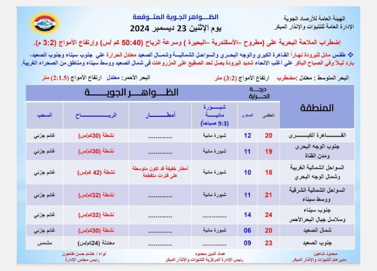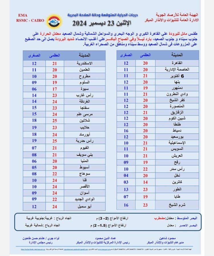 درجات الحرارة اليوم الأثنين 23 ديسمبر 2024: القاهرة العظمى 20 درجة والصغرى 13، والإسكندرية العظمى 21 والصغرى 12، ومطروح العظمى 20 درجة والصغرى 12، وسوهاج العظمى 22 درجة، والصغرى 08، وقنا العظمى 24 درجة والصغرى 11، وأسوان العظمى 24 درجة والصغرى 12.