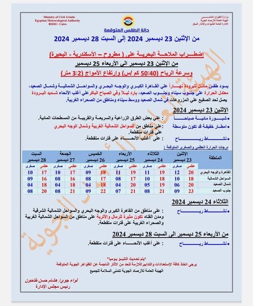 وأشارت هيئة الأرصاد العامة إلى أنه من المتوقع اليوم أمطار خفيفة قد تكون متوسطة على مناطق متفرقة وفترات متقطعة من السواحل الشمالية الغربية وشمال الوجه البحرى، مع وجود اضطراب فى الملاحة البحرية على مطروح والإسكندرية وسرعة الرياح 40: 50 كم فى الساعة وارتفاع الأمواج من 2: 3 متر .