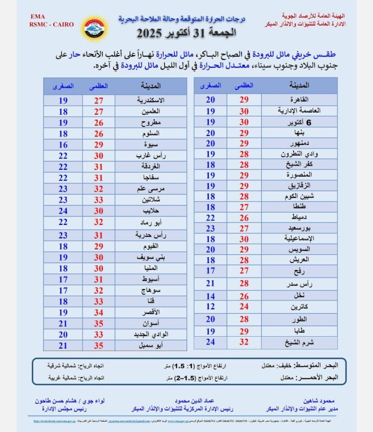 درجات الحرارة اليوم الجمعة 31 أكتوبر 2025 :القاهرة العظمى 29 درجة والصغرى 20 درجة. الإسكندرية العظمى 27 درجة والصغرى 19 درجة. مطروح العظمى 26 درجة والصغرى 19 درجة. سوهاج العظمى 32 درجة والصغرى 17 درجة. قنا العظمى 33 درجة والصغرى 18 درجة. أسوان العظمى 35 درجة والصغرى 21 درجة.