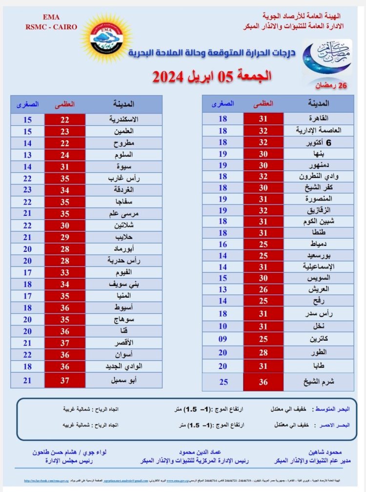 وبالنسبة لدرجات الحرارة اليوم الجمعة 5 إبريل 2024: القاهرة العظمى 31 درجة والصغرى 18، والإسكندرية العظمى 22 والصغرى 15، ومطروح العظمى 22 درجة والصغرى 14، وسوهاج العظمى 35 درجة والصغرى 20، وقنا العظمى 36 درجة والصغرى 20، وأسوان العظمى 36 درجة والصغرى 22.